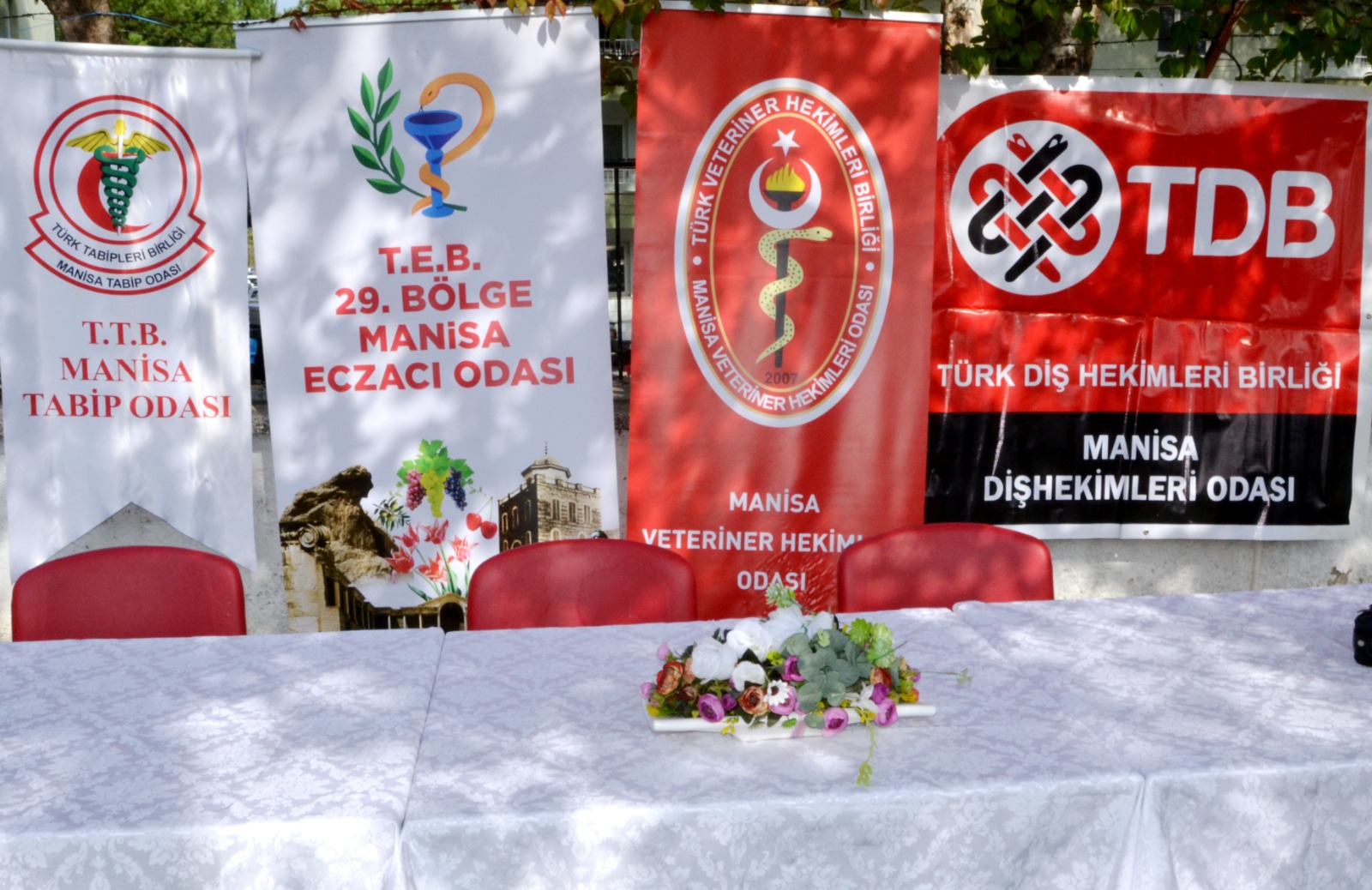 Basın açıklamasına Manisa Veteriner Hekimleri Odası Başkanı Ali Gök, Manisa Tabip Odası Genel Sekreteri Dr. İsmail Eken, Manisa Dişhekimleri Odası Yönetim Kurulu Üyesi Köksal Gürsoy ve Manisa Eczacı Odası Yönetim Kurulu Üyesi Ecz. Alperen Uyar katılım sağladı.