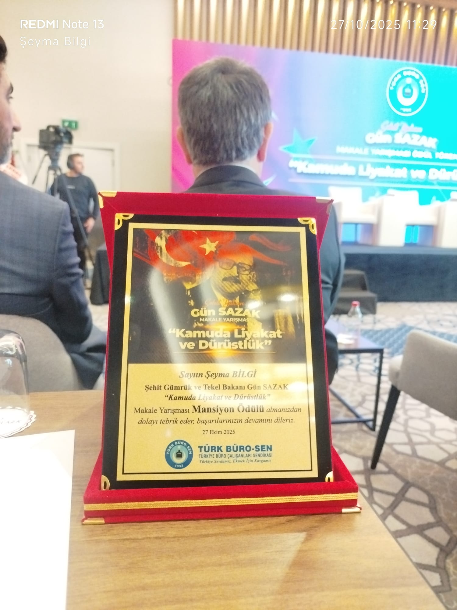 Manisa Türk Büro-Sen 1 No’lu Şube üyesi olarak yarışmaya katılan Şeyma Bilgi, “Kamuda Liyakat ve Dürüstlük” temalı makalesiyle Mansiyon Ödülüne layık görüldü.