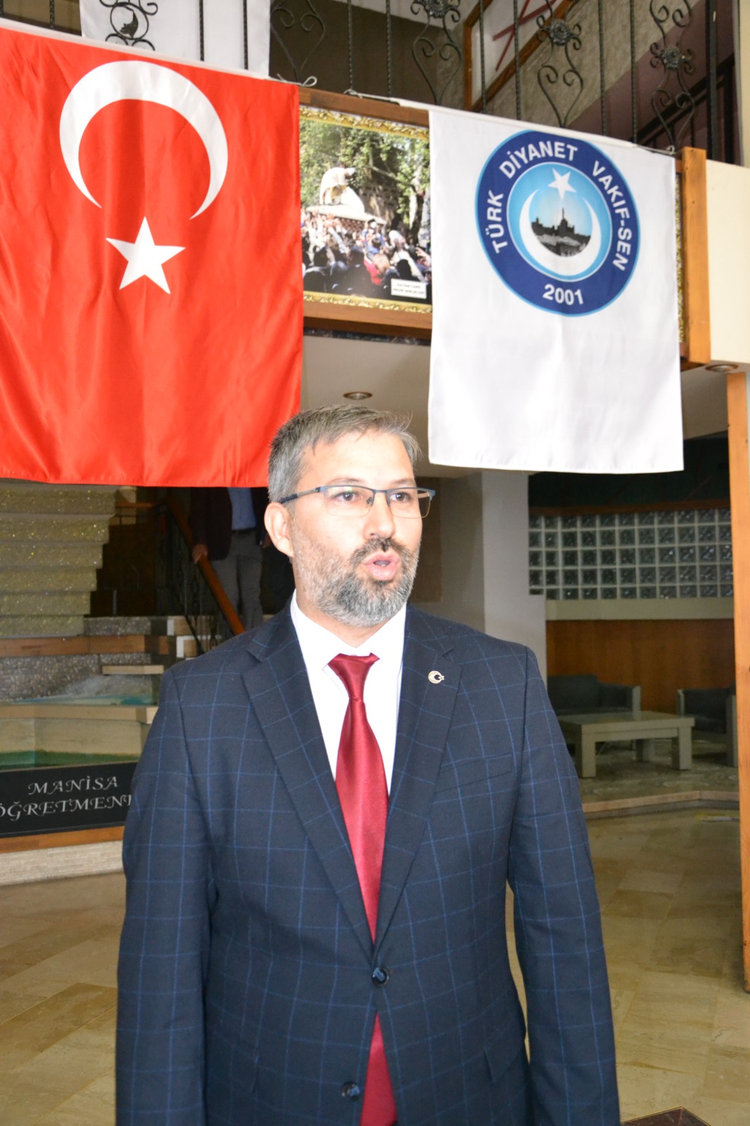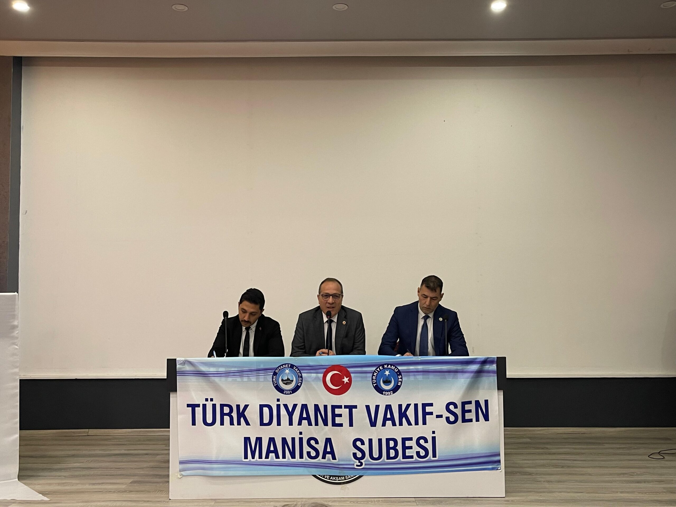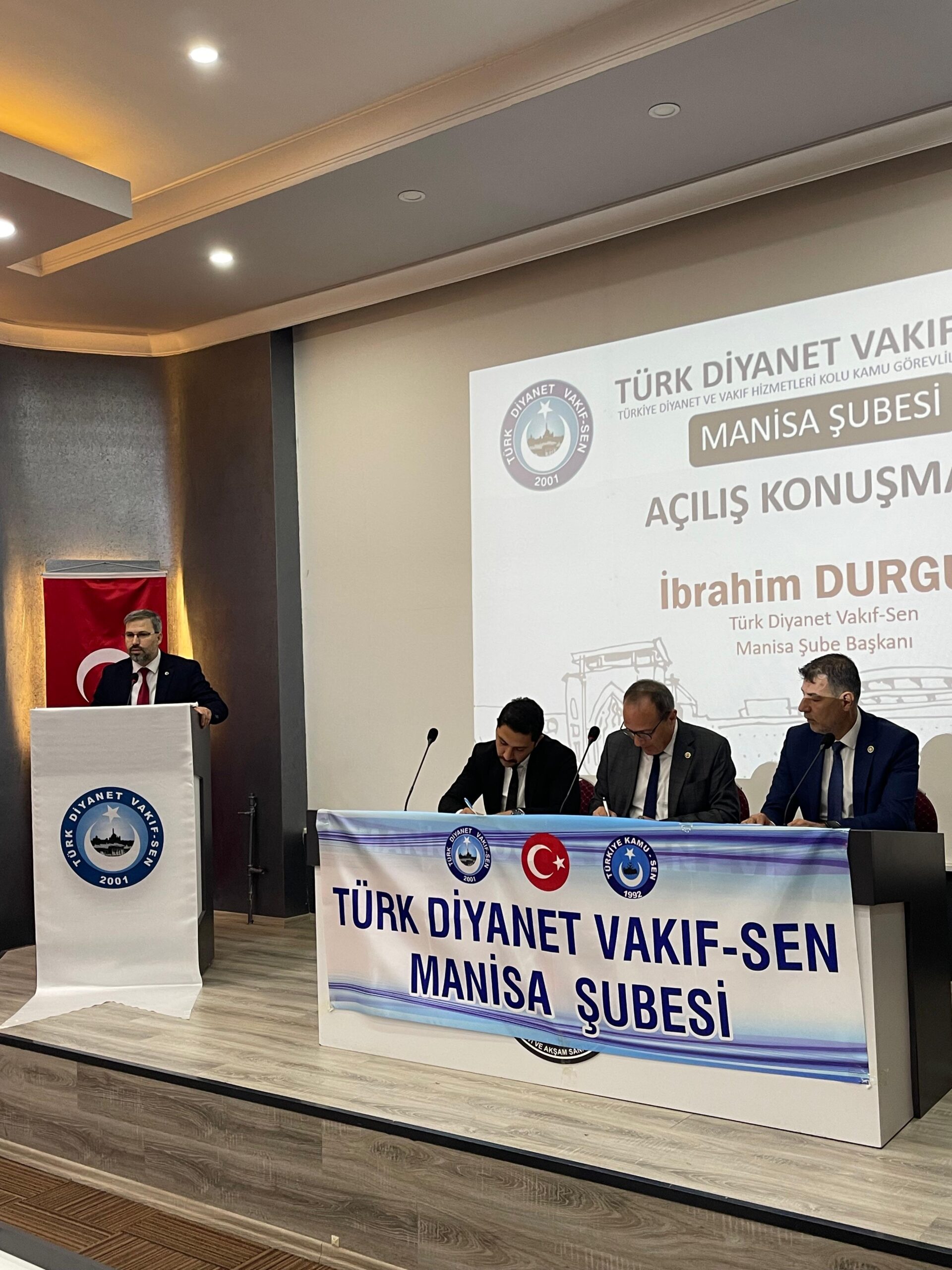 Türk Diyanet Vakıf-Sen Manisa Şube Başkanı İbrahim Durgut, genel kurula katılan herkese sendika adına teşekkür etti. Başkan Durgut, “Bize güç veren, bu mücadelenin her biri ayrı kahraman olan siz değerli üyelerimiz ve delegelerimiz, şubemizin teşkilat yöneticileri ve aramıza katılarak bize onur veren değerli dostlarımız, gönüldaşlarımız; Bizler, Bu mücadelede Haksızlığa dur demek için, inançlarımız, değerlerimiz, bayrağımız, ekmeğimiz, aşımız, çocuklarımız ve geleceğimiz diyerek "İnsanların hayırlısı insanlara faydalı olandır" diyerek, "Hakkın hatırı hiçbir hatıra feda edilmez" diyerek, bu mücadeleyi; 24 yıllık tecrübe ve temiz mazisiyle Türk Diyanet Vakıf-Sen çatısı altında hep birlikte, tek vücut olarak yürüttük ve yürütmeye devam edeceğiz. 24 yıl önce sendikamızın kurulmasına öncülük eden Kurucu Genel Başkanı merhum Tevfik Yüksel Beyi vefatının 20 yılında rahmet, şükran ve dualarla anıyoruz. Bu vesile ile başta merhum Tevfik Yüksel başkanımız olmak üzere, Sendikamızın kuruluşundan bugüne kadar ahirete irtihal etmiş bütün üyelerimize ve gönül dostlarımıza Yüce Allah’tan rahmet niyaz ediyorum. Bu kutlu görevde ömrünün en güzel yıllarını vermiş ve emekliye ayrılmış tüm üyelerimize de sağlık ve afiyetler diliyorum. Türk Diyanet Vakıf-Sen ve Türkiye Kamu-Sen kurulduğu günden itibaren, bizim ilkemiz önce ülkemiz anlayışıyla yola çıkmıştır. İlkeli, kararlı, sorumlu ve ahlaklı bir sendikal anlayışın öncüsü olarak, Diyanet çalışanlarımızın yanında olduk ve olmaya devam etmekteyiz. Bizlerin sendikal anlayışımızda bir mottomuz vardır. Biz öncelikle insanız, sonra Müslümanız, sonra Diyanet çalışanıyız, sonra Türk Diyanet Vakıf Senliyiz. Güzele, doğruya ve iyiliklere araç olarak gördüğümüz sendikal faaliyetleri, Diyanet çalışanı olduğumuzu unutmadan yerine getiriyoruz. Son dönemde kurumuzda güven ve aidiyet sorunları yaşanmaktadır. Maalesef ki cübbe ve sarık çok yoruldu. Kurum ne kadar güçlü ise, çalışan ne kadar mutlu ise bundan en fazla biz gurur duyarız. Kurulduğumuz günden itibaren Türk Diyanet Vakıf-Sen olarak büyük diyanet çatısını delmemek için yıpratmamak için usulünce üslubunca sendikal faaliyetler yapmaya çalıştık. Sendikal nezaket ortamı oluşturmak için elimizden geleni yapsakta maalesef diğer sendikalardan karşılık bulamadık. Bu dönem nezakette ısrarcı olmayacağımızın da bilinmesini isteriz” dedi.