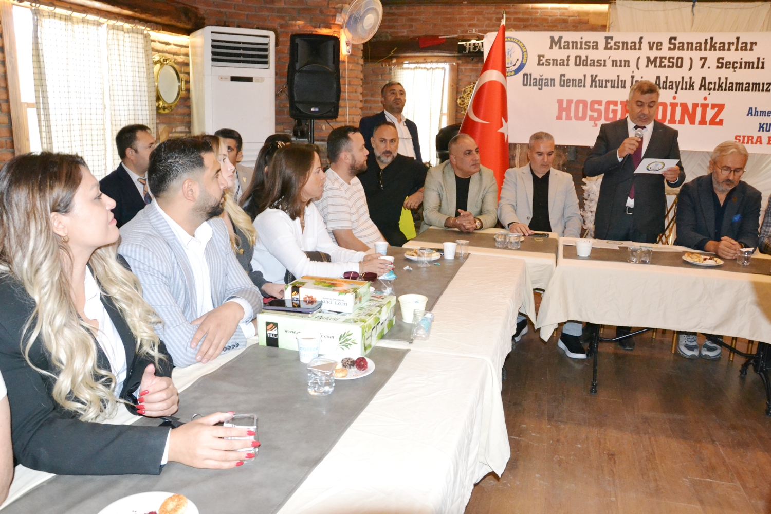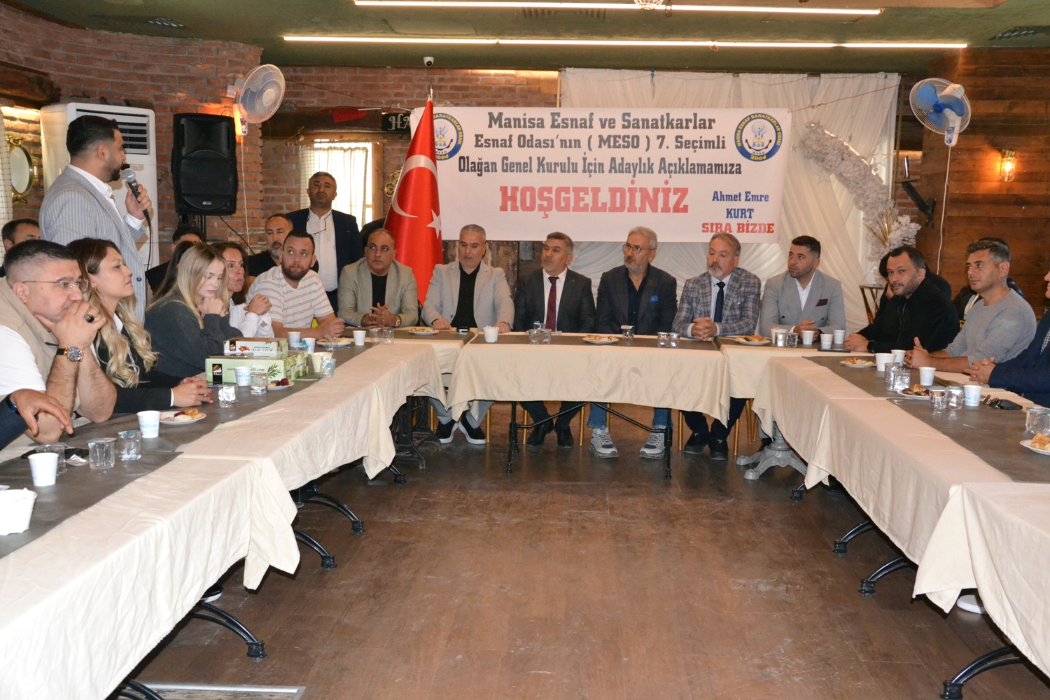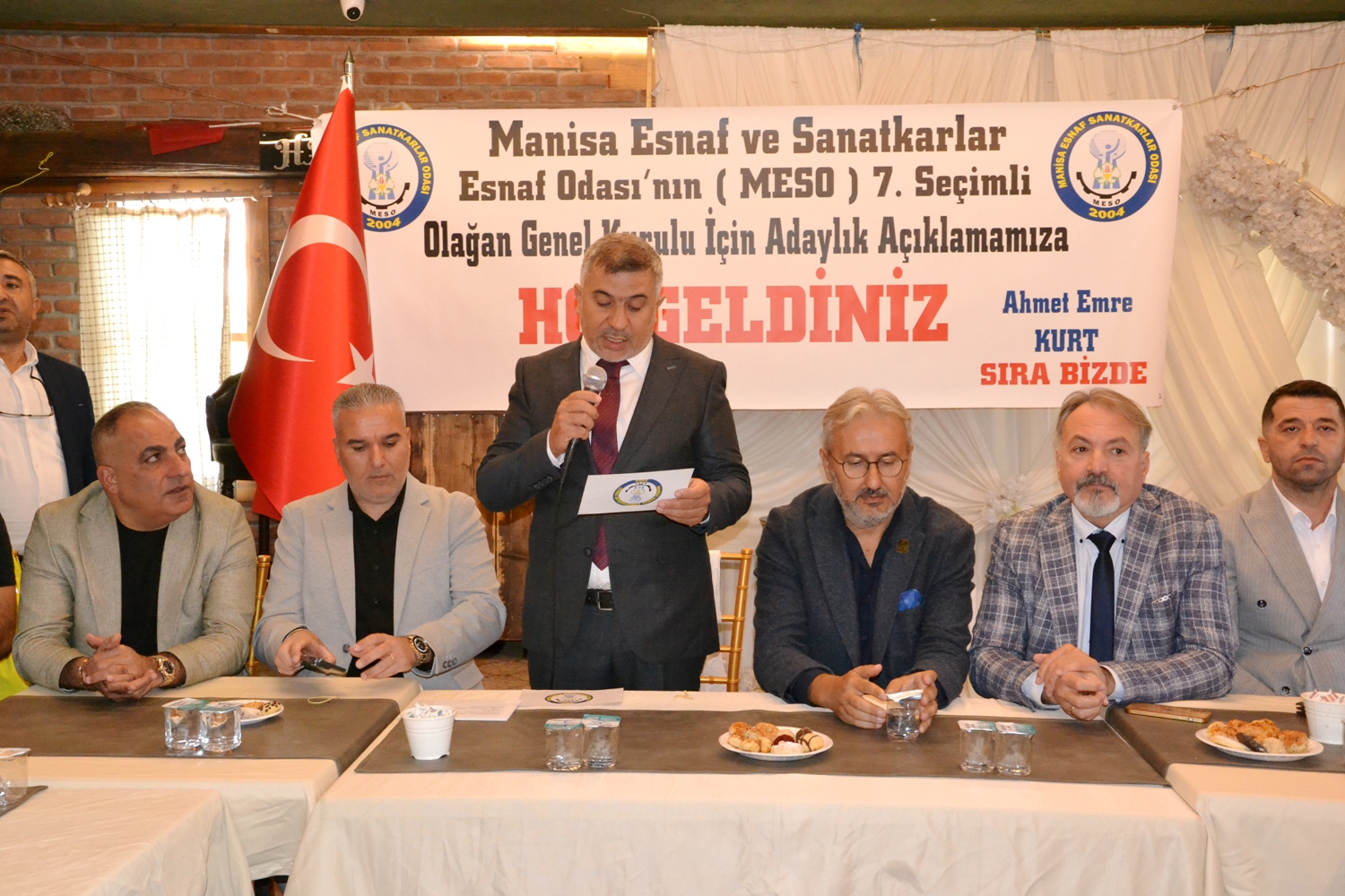 Adaylığını açıklayan Emre Kurt, “Bugün burada Manisa esnafımızın geleceği, bir hayalin gerçekleşmesi adına atılan ilk adamın startını vermek için bir araya geldik. 2026 yılı Manisa esnafımızın kaderini çizeceği, geleceğe güvenle bakabilme adına bir karar vereceği önemli bir yıl olacak. Şehzadeler şehri, Ahi Evran yolu Manisa’mızda ilimizin en büyük ikinci odası olan Manisa Esnaf Odası'na (MESO) ekibimizle birlikte bir kez daha talip olduk. 2 bini aşkın üye sayımızla Olağan Genel Kurulumuzda değerli üyelerimizin karşısına çıkarak güveninizi isteyeceğiz. Bu sebeple Manisa esnafı için sıra bizde diyoruz” dedi.