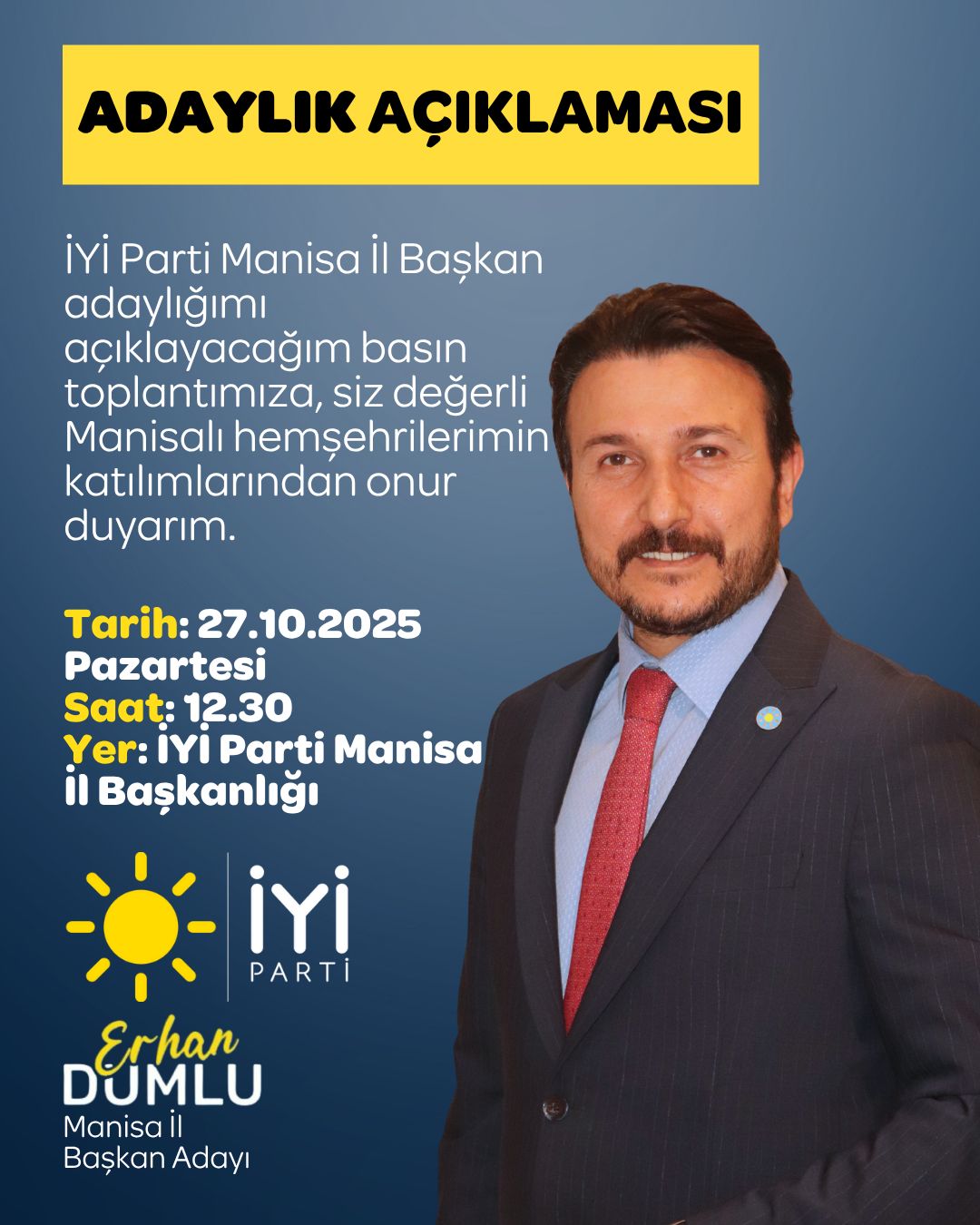 Dumlu yaptığı açıklamada, “27.10.2025 Pazartesi günü saat 12.30’da İYİ Parti Manisa İl Başkanlığı’nda İYİ Parti Manisa İl Başkanı adaylığımı açıklayacağım. Toplantımıza sizleri de aramızda görmekten onur duyarım” ifadelerini kullandı.