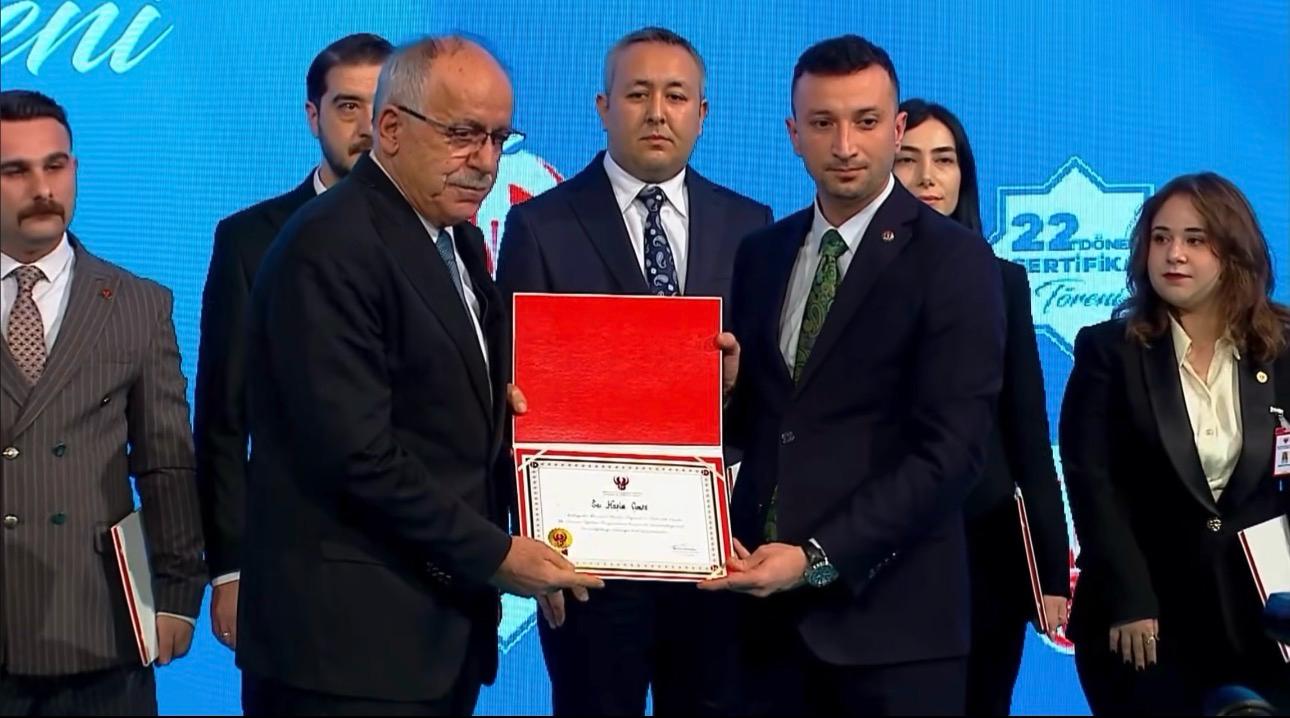 Haşim Çimen’in sertifikası, MHP Genel Başkan Yardımcısı ve Konya Milletvekili Mustafa Kalaycı tarafından takdim edildi.