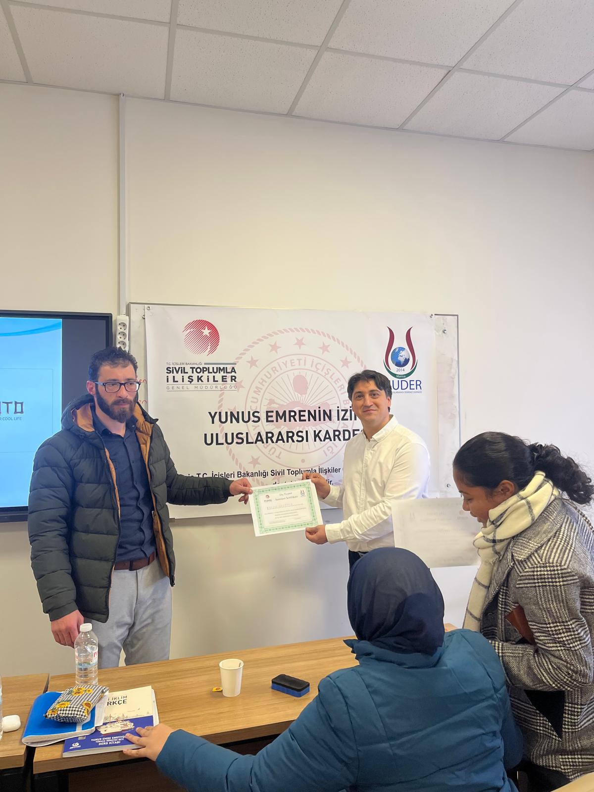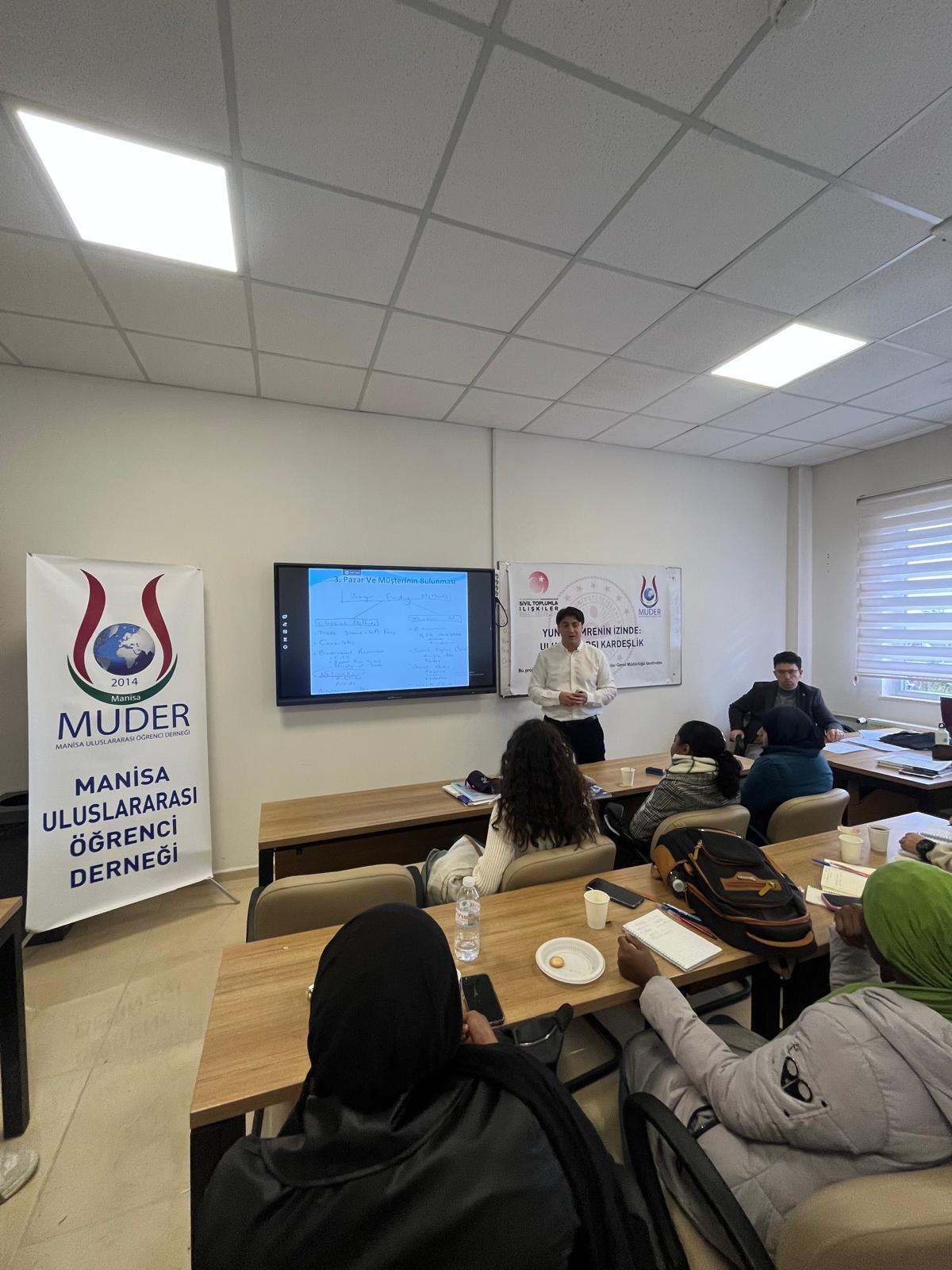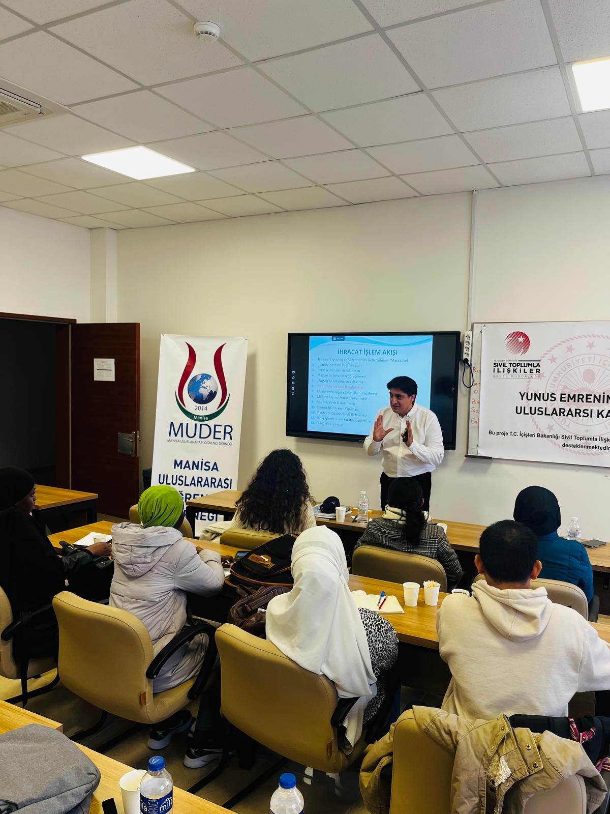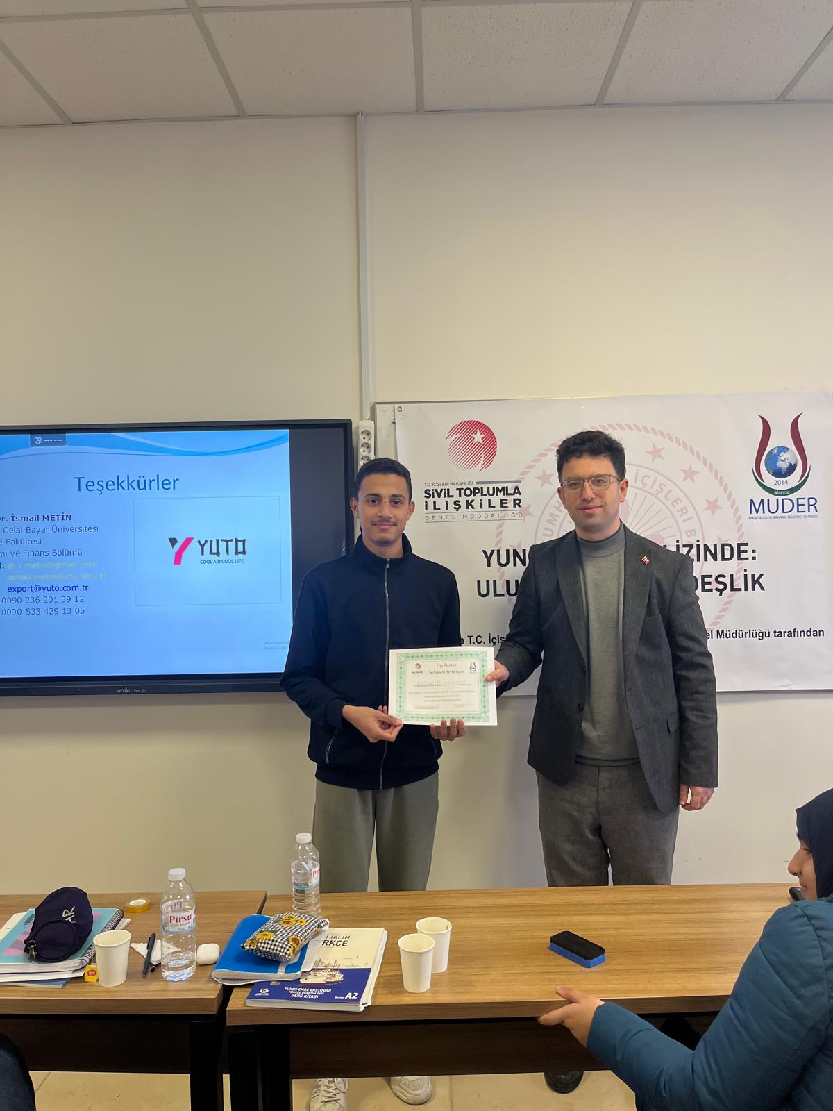 Ana Sayfa › HABERLER › MUDER’den Uluslararası Öğrencilere Dış Ticaret Eğitimi MUDER’den Uluslararası Öğrencilere Dış Ticaret Eğitimi Manisa Medya.com TÜM YAZILARI Giriş: 27-12-2025 20:56 HABERLER ABONE OL Manisa Uluslararası Öğrenci Derneği (MUDER) tarafından yürütülen ve Sivil Toplumla İlişkiler Genel Müdürlüğü’nün desteklediği “Yunusemre’nin İzinde Uluslararası Kardeşlik” projesi kapsamında düzenlenen seminerler devam ediyor. Proje çerçevesinde gerçekleştirilen 2. Dış Ticaret Semineri, Manisa Celal Bayar Üniversitesi (MCBÜ) öğretim üyesi Doç. Dr. İsmail Metin tarafından verildi. Seminerde, katılımcı öğrencilere dış ticaret konusu kapsamlı bir şekilde anlatıldı. Uluslararası öğrencilerin yoğun ilgi gösterdiği etkinlikte, sektörel bilgi ve tecrübeler paylaşılırken, dış ticaretin temel dinamikleri ve uygulamaları hakkında önemli bilgiler aktarıldı. Programın sonunda seminere katılan öğrencilere katılım sertifikaları, MUDER Başkanvekili Aras Güzgülü, Doç. Dr. İsmail Metin ve CBÜ DİLMER Öğretim Görevlisi Adviye Rabia Tekin tarafından takdim edildi. Seminerlerin, proje kapsamında farklı başlıklarla devam edeceği bildirildi