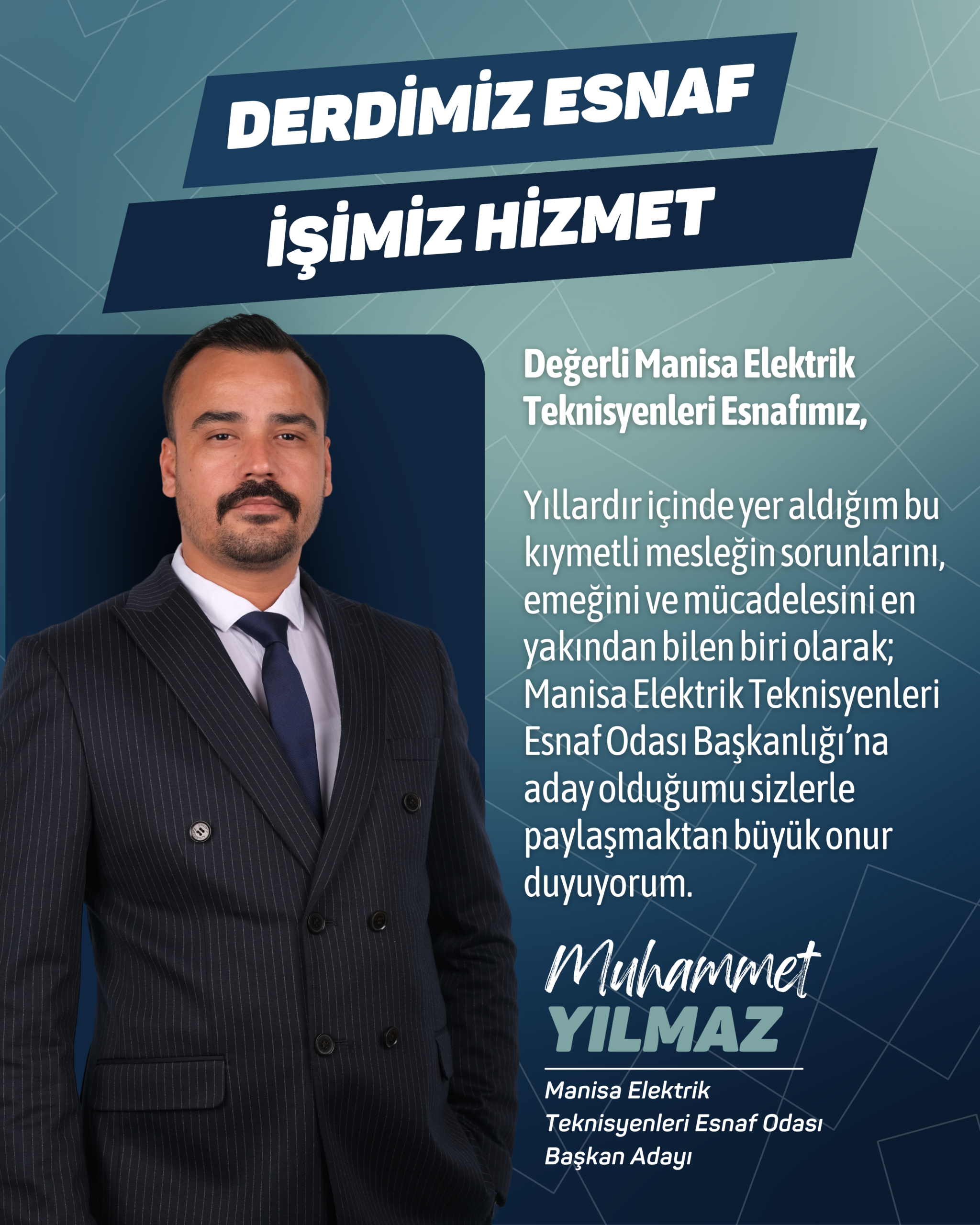 Muhammet Yılmaz yaptığı açıklamada” Yıllardır içinde yer aldığım bu kıymetli mesleğin sorunlarını, emeğini ve mücadelesini en yakından bilen biri olarak; Manisa Elektrik Teknisyenleri Esnaf Odası Başkanlığı’na aday olduğumu sizlerle paylaşmaktan büyük onur duyuyorum. Elektrik teknisyenleri esnafımız, şehrimizin üretim gücünün ve hizmet zincirinin en güçlü dayanaklarından biridir. Sizlerin ihtiyaçlarını dinlemek, sorunlara çözüm üretmek ve hak ettiğiniz değeri oda yönetiminde görünür kılmak temel hedefim olacaktır.
