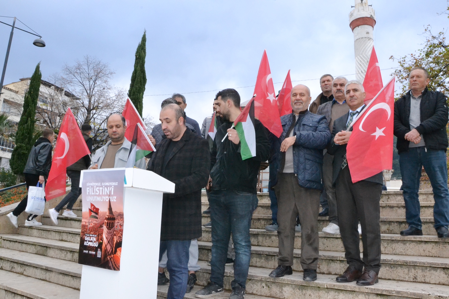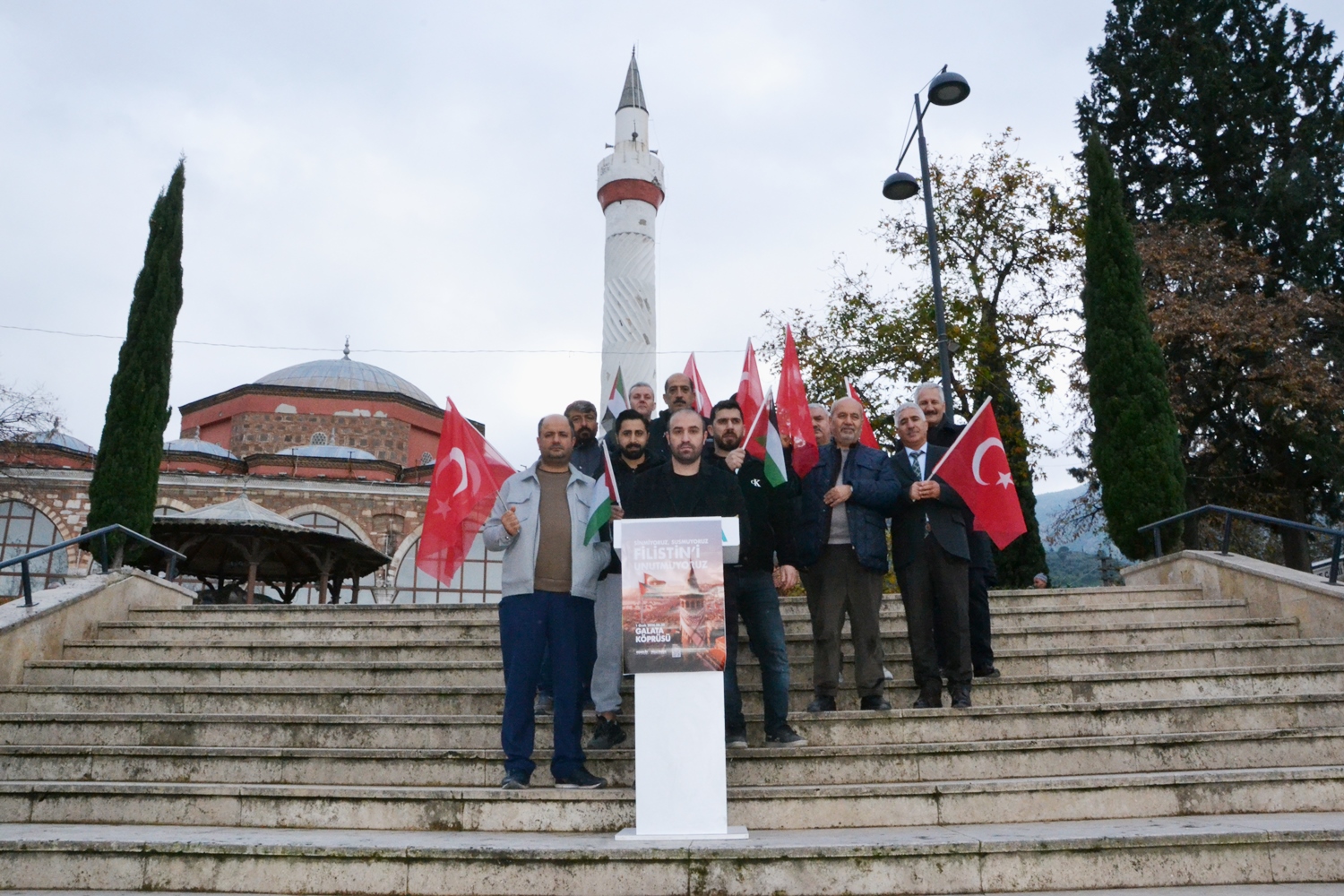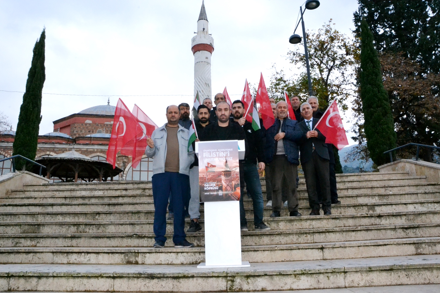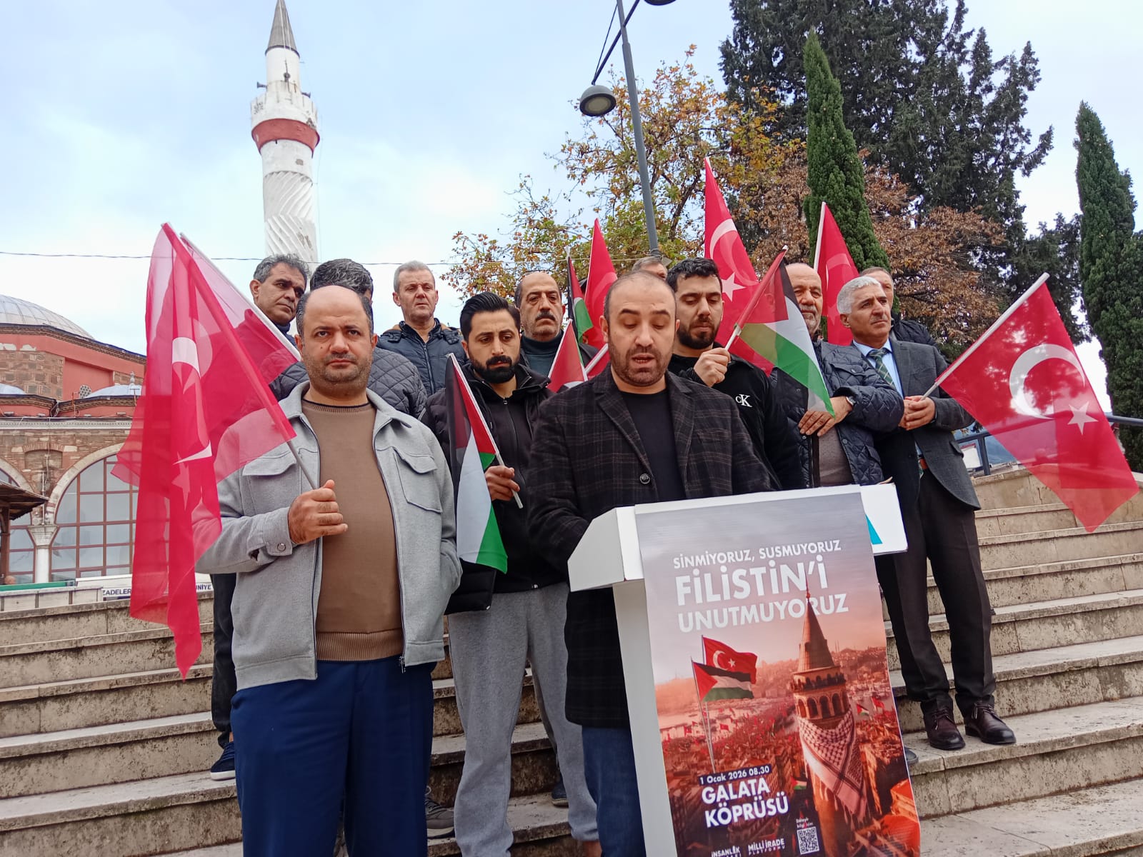 Türkiye Gençlik Vakfı (TÜGVA) Manisa İl Temsilciliği, 1 Ocak’ta İstanbul Galata Köprüsü’nde düzenlenecek Filistin eylemine destek açıklaması yaptı. Hatuniye Camii önünde gerçekleşen açıklamada Türk ve Filistin bayrakları tuttular.